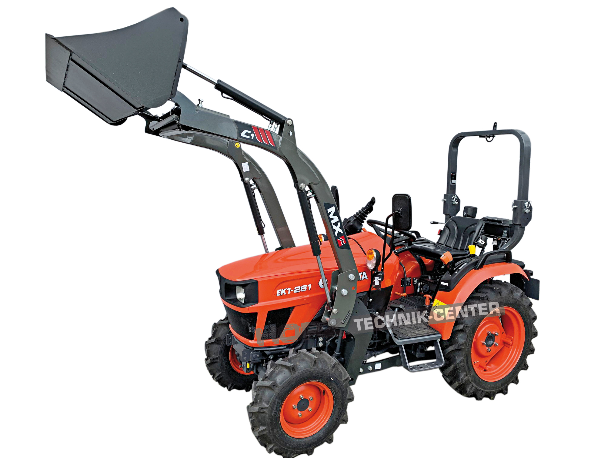 - Inkl. Markenfrontlader EK1 mit Schnellwechsler System SKID STEER oder EURO, max. Hubhöhe 1,75m (Schaufelunterkante), max. Hubkraft 530kg (am Werkzeugkoppelpunkt)
